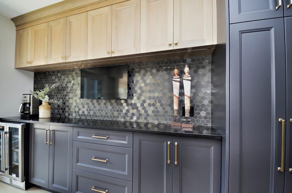 Design-wise, the space blends modern and classic elements for a balanced and dynamic look. Hale Navy cabinetry adds depth and richness, while light wood uppers and crisp white drawers introduce warmth and contrast. A glass tile backsplash in a soft hexagon pattern adds shimmer and texture, enhancing the sense of elegance without overwhelming the space.